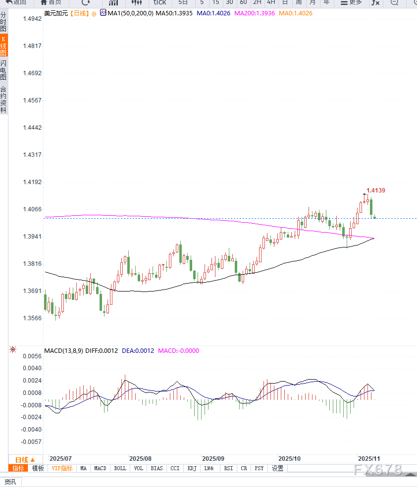 技术面上,USD/CAD 日线显示短期在1.4030 附近震荡,下方支撑位约在1.4000附近,阻力位关注 1.4060。整体偏弱,短期仍以加元强势、美元承压格局运行。