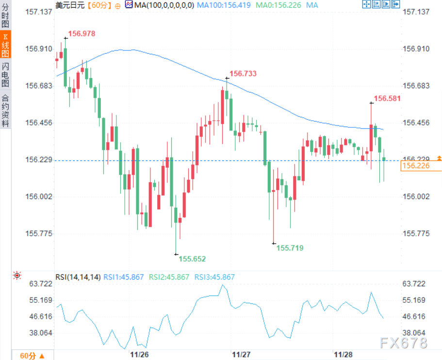 汇通财经APP讯——尽管日本国内数据总体向好,美元兑日元在周五(11月28日)亚洲交易时段仍动能不足,于156.25附近窄幅震荡。投资者持续担忧政府大规模经济刺激计划导致的财政状况恶化——这也正是近日日本国债收益率飙升的关键诱因。此外,市场对美联储降息预期及俄乌和平协议前景的乐观情绪,共同营造了普遍的风险偏好氛围,持续削弱避险货币日元的吸引力。